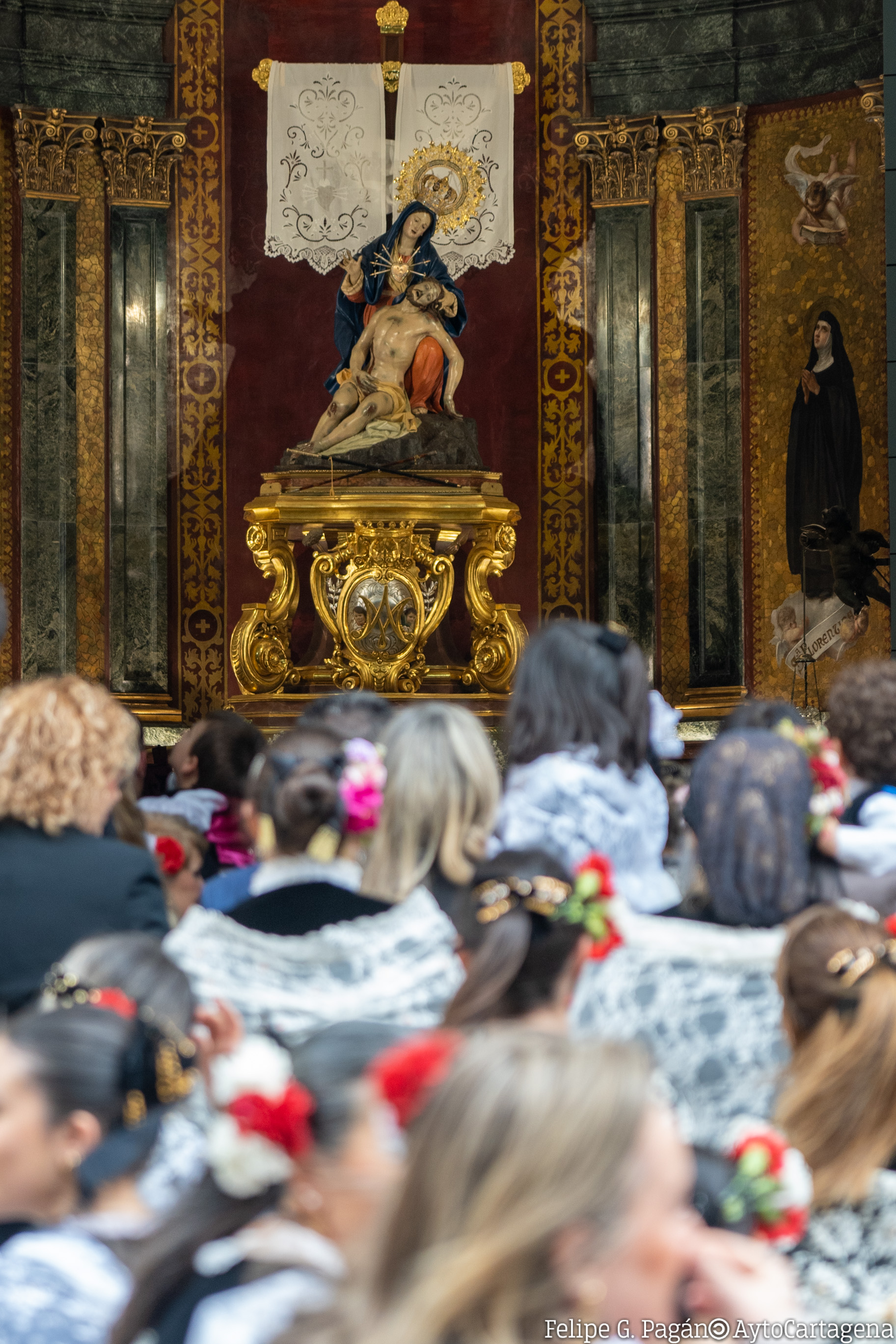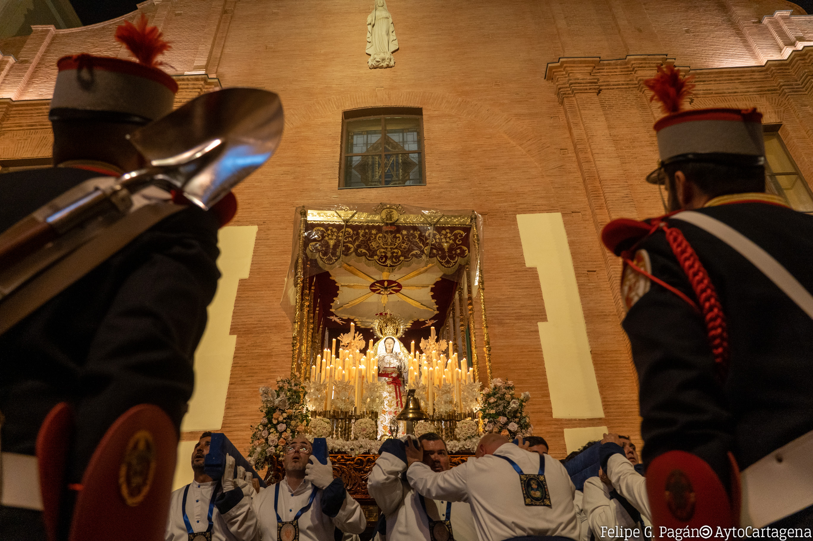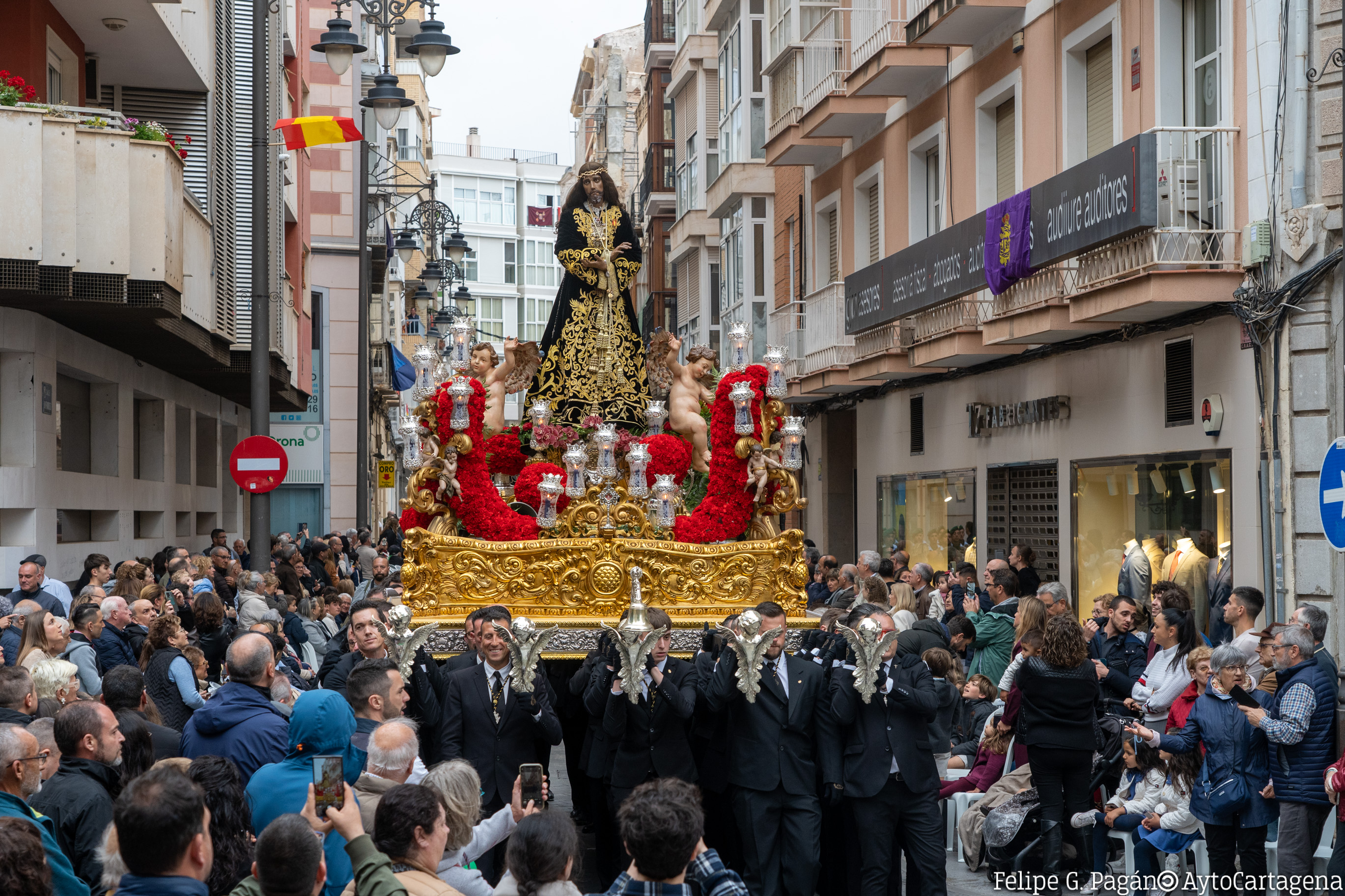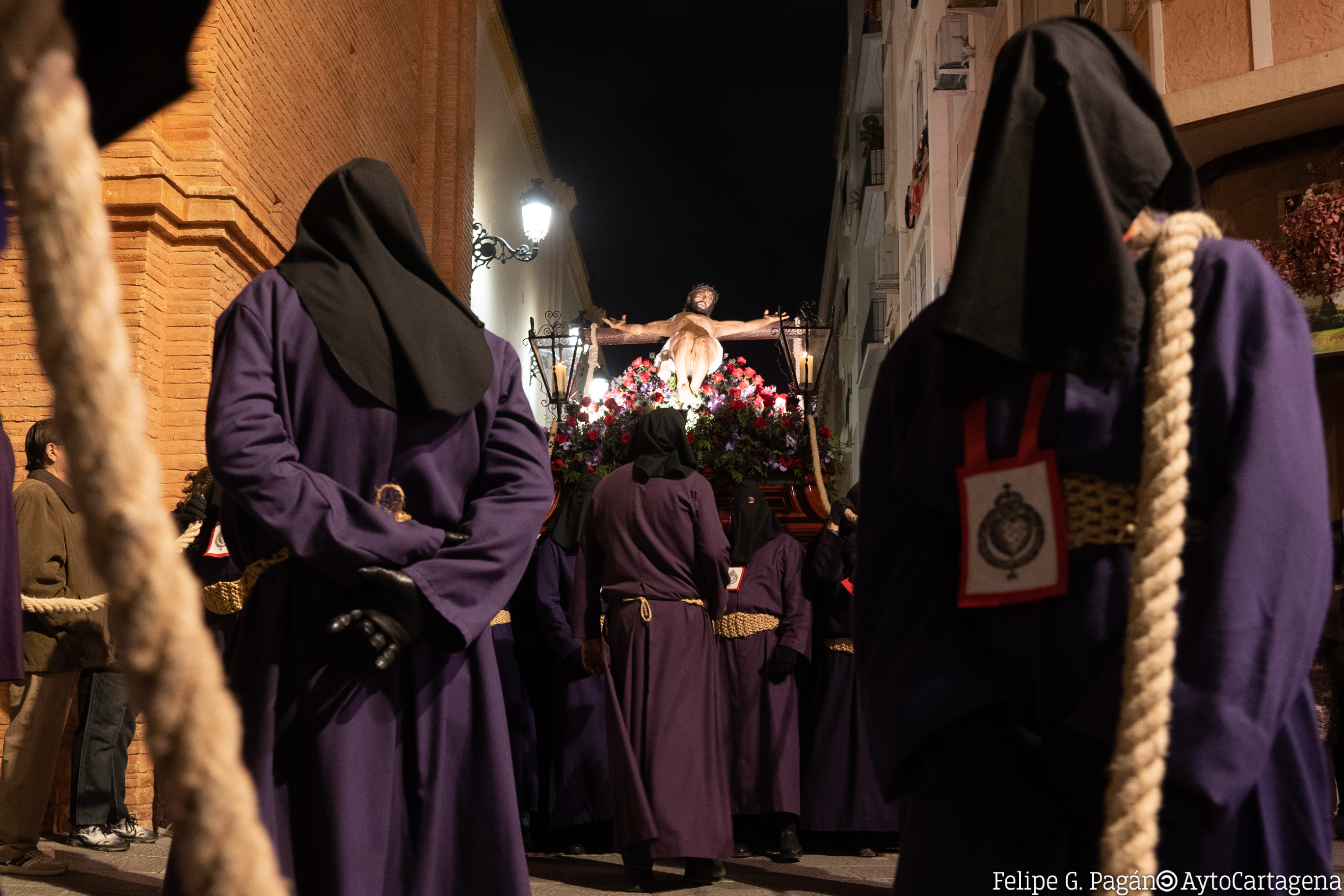 Parte del final de la calle Sepulcro, y sigue por calle de la Concepción, plaza de San Ginés, calles de San Francisco, Campos, San Miguel y Aire, donde se detiene en la iglesia de Santa María de Gracia, en estación ante la Virgen del Rosell, antigua patrona de Cartagena. Sigue su camino por Aire, plaza de San Sebastián, Honda, lado norte de la plaza de San Francisco, Arco de la Caridad, San Vicente, plaza del Sevillano, Serreta y Caridad, deteniéndose en la Basílica de Nuestra Señora de la Caridad a las 06:00 horas, para la celebración de la Estación de Penitencia y de la primera misa del Viernes de Dolores.