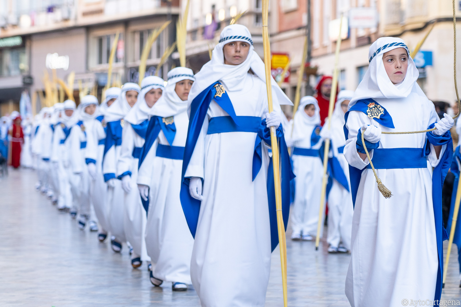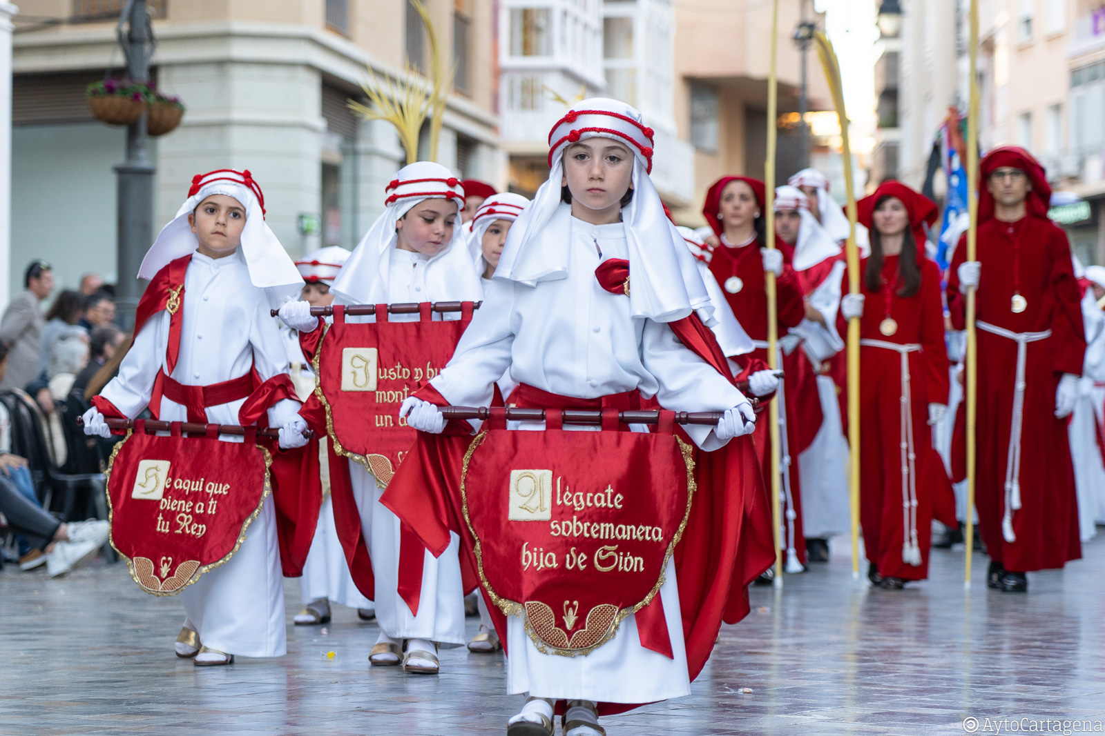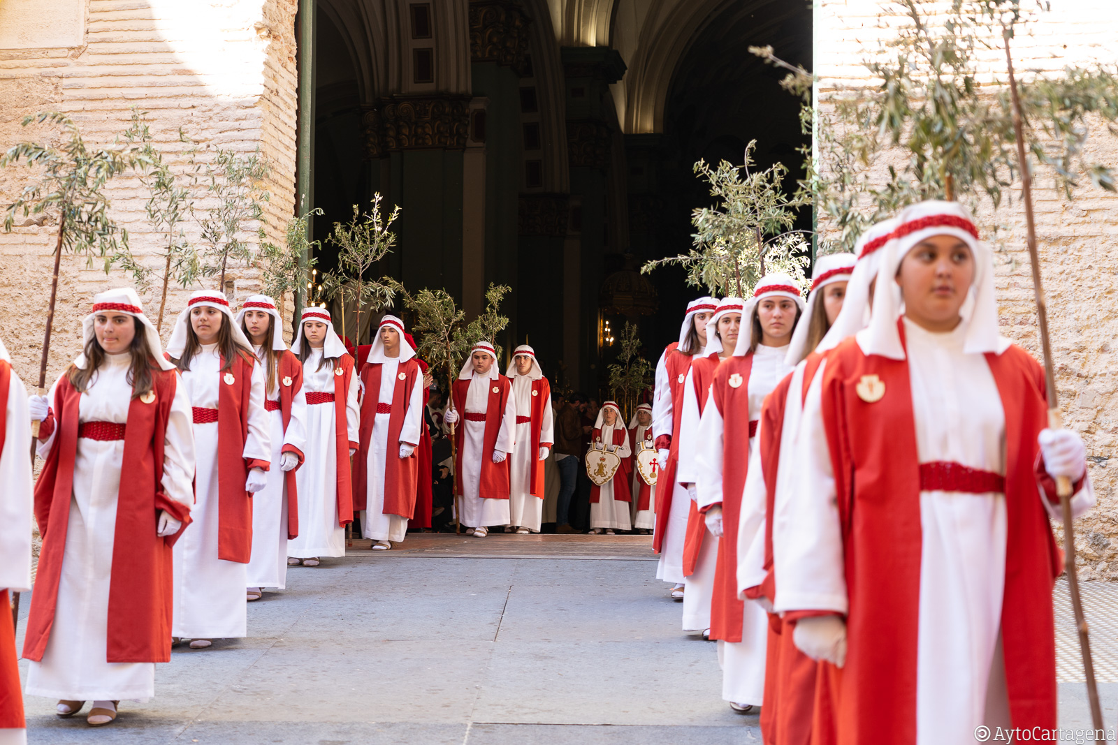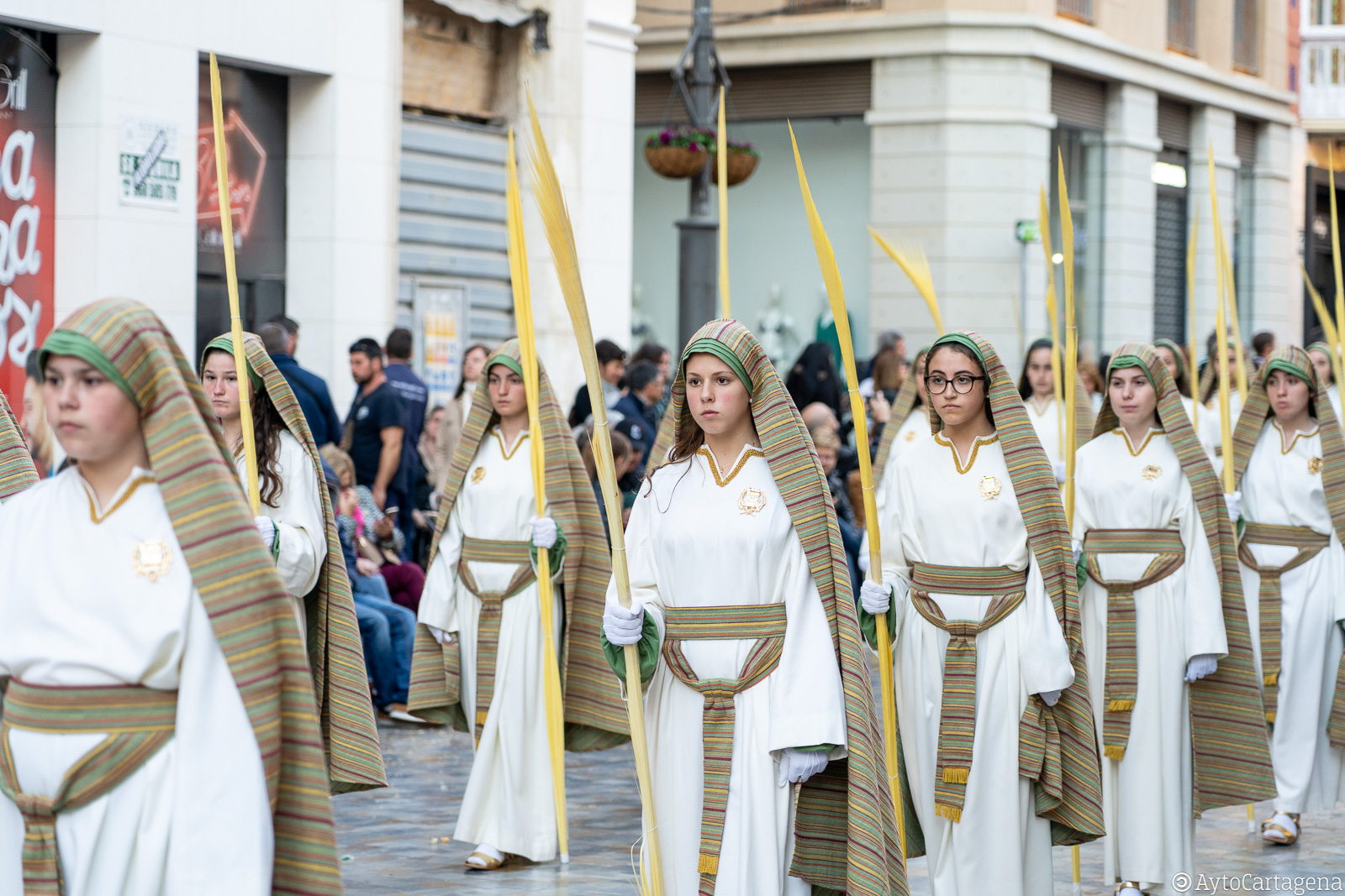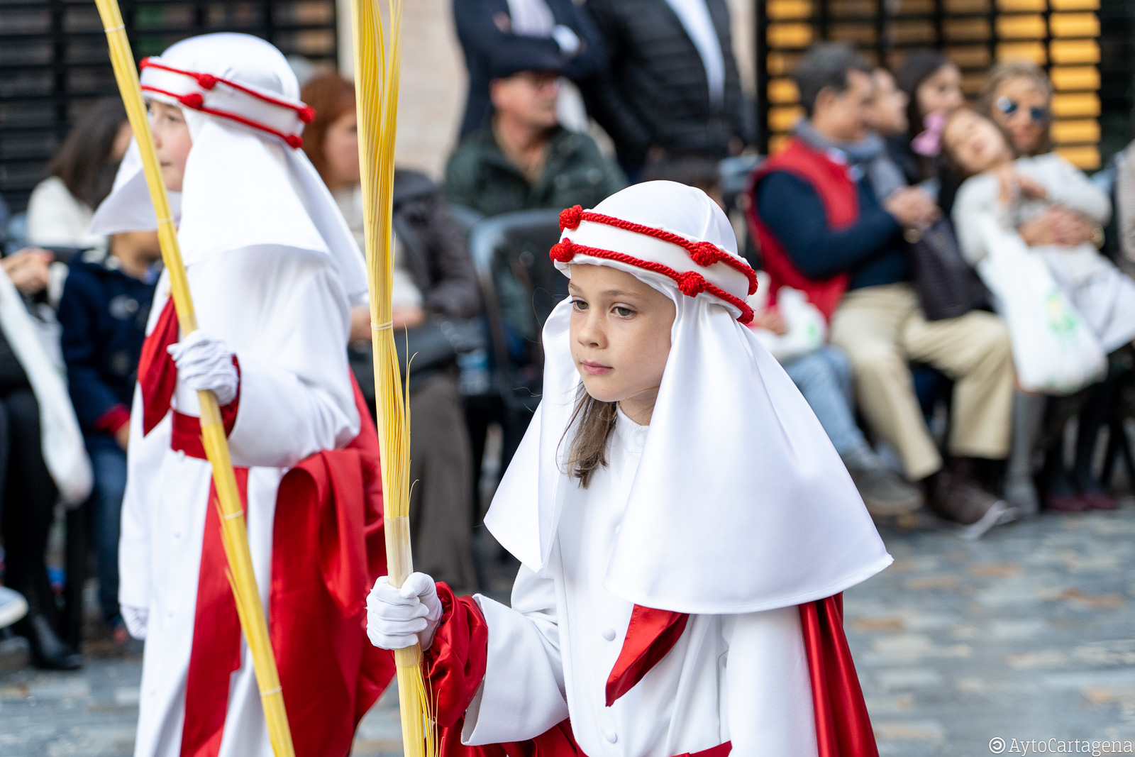 Las calles de la ciudad se inundaron de niños ataviados con trajes de hebreos conjuntados por los colores de las agrupaciones a las que pertenecen. Un desfile salpicado de palmas y varas de olivos armonizado con el típico ritmo cadencioso de las procesiones cartageneras.