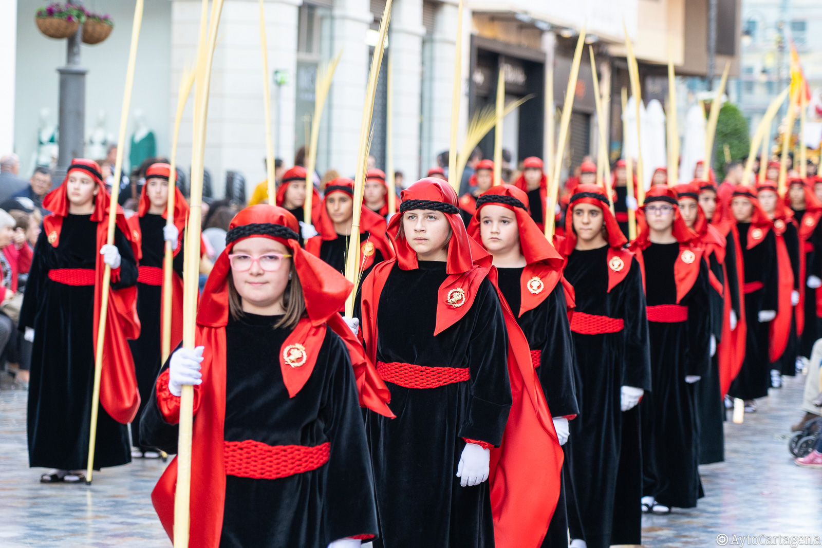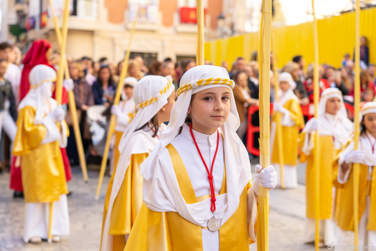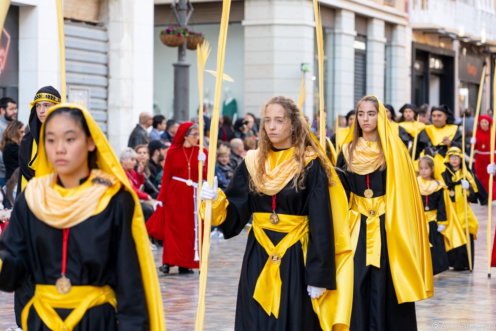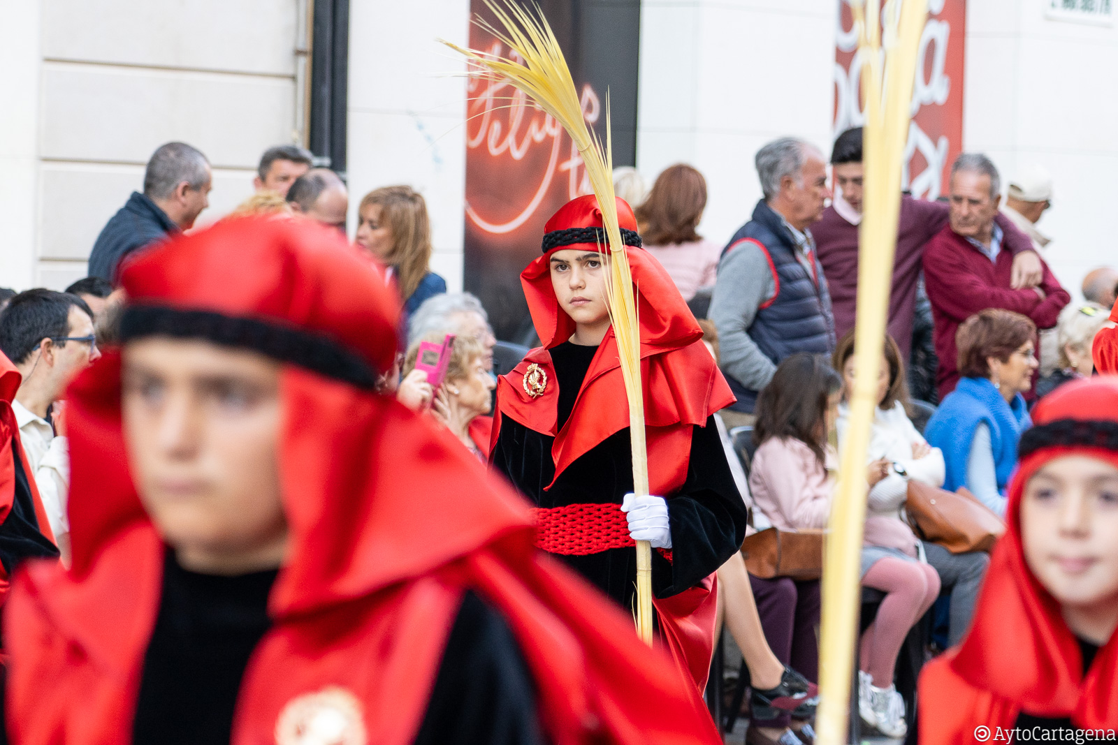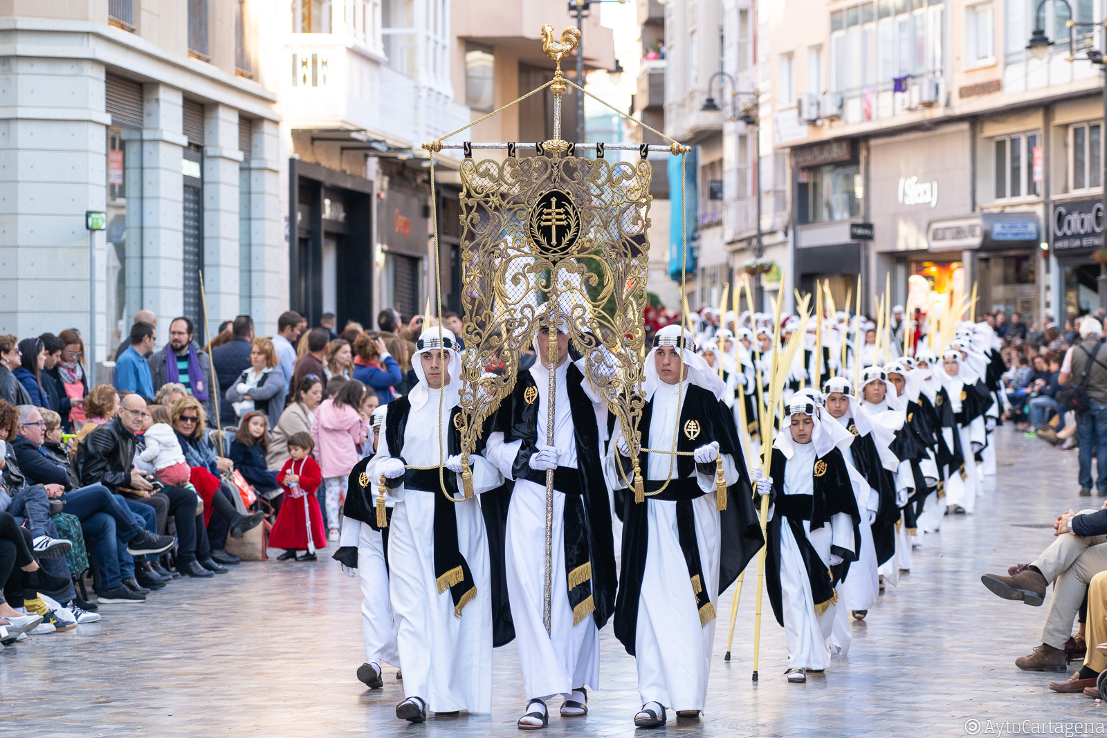 Las calles de la ciudad se inundaron de niños ataviados con trajes de hebreos conjuntados por los colores de las agrupaciones a las que pertenecen. Un desfile salpicado de palmas y varas de olivos armonizado con el típico ritmo cadencioso de las procesiones cartageneras.