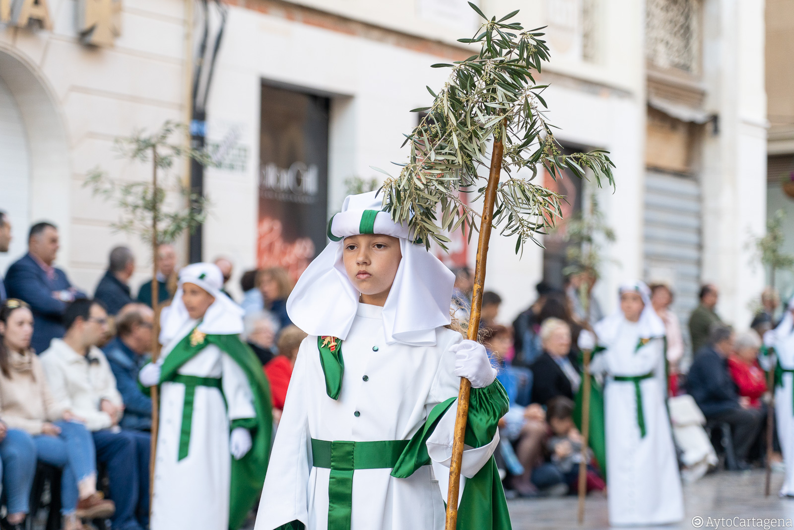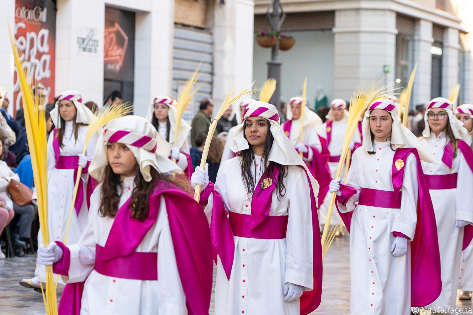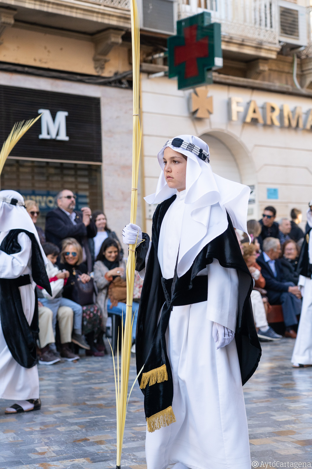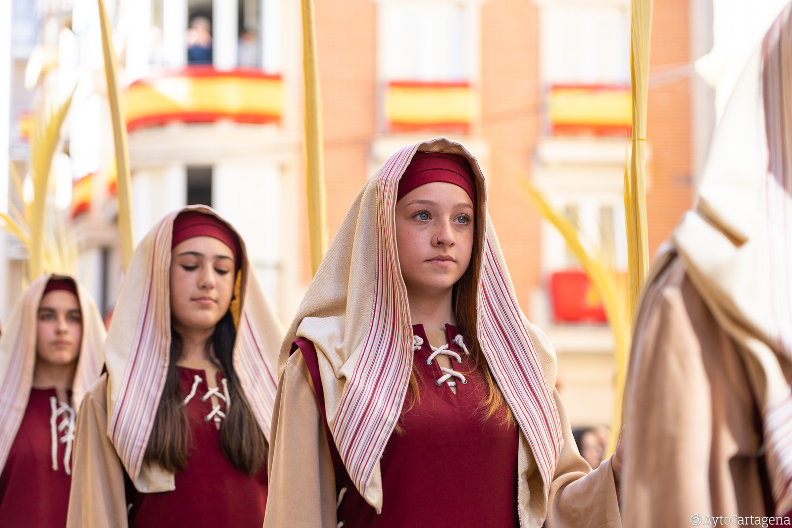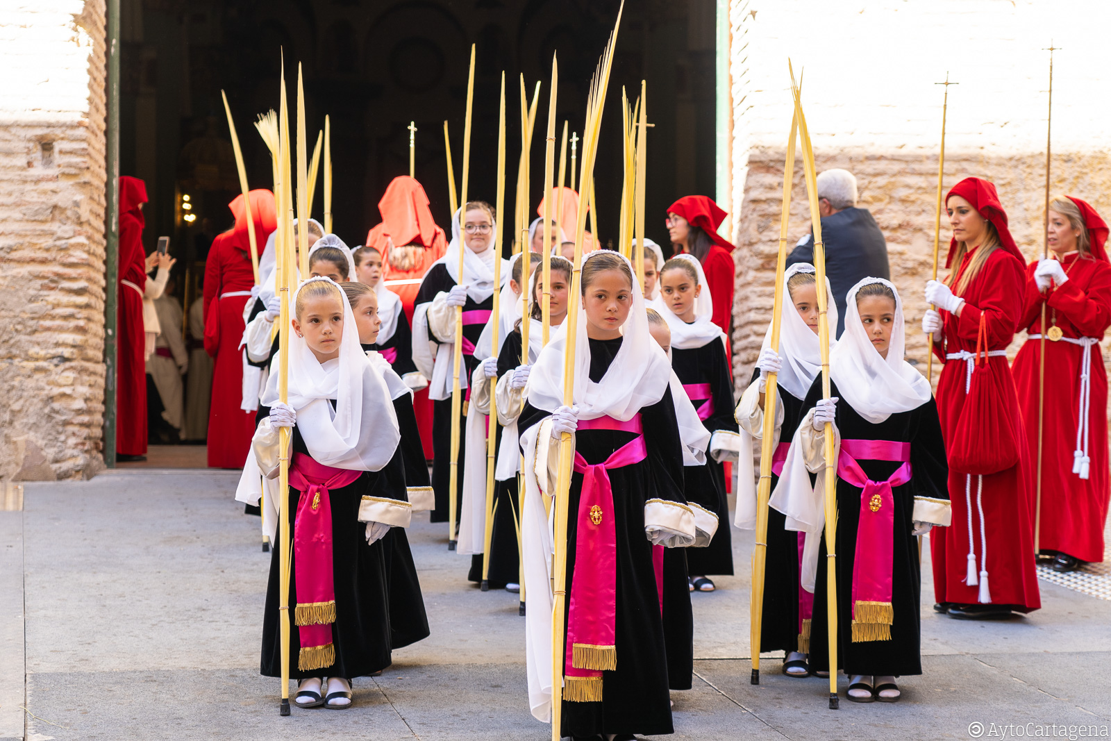 Las calles de la ciudad se inundaron de niños ataviados con trajes de hebreos conjuntados por los colores de las agrupaciones a las que pertenecen. Un desfile salpicado de palmas y varas de olivos armonizado con el típico ritmo cadencioso de las procesiones cartageneras.