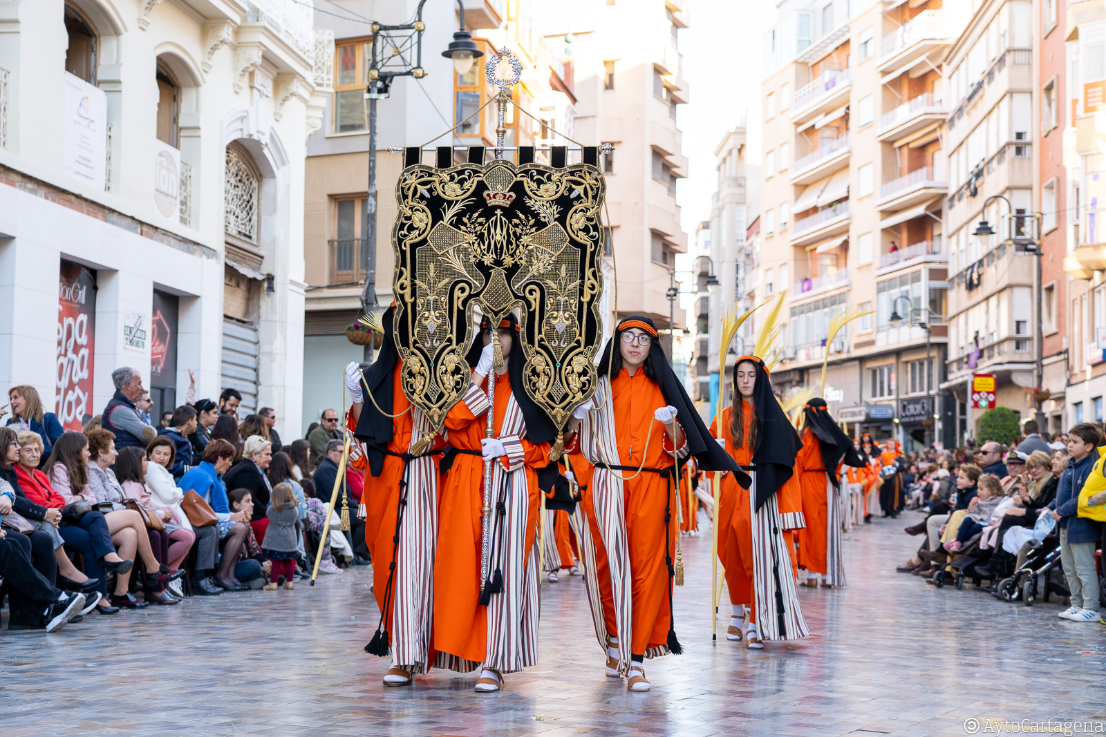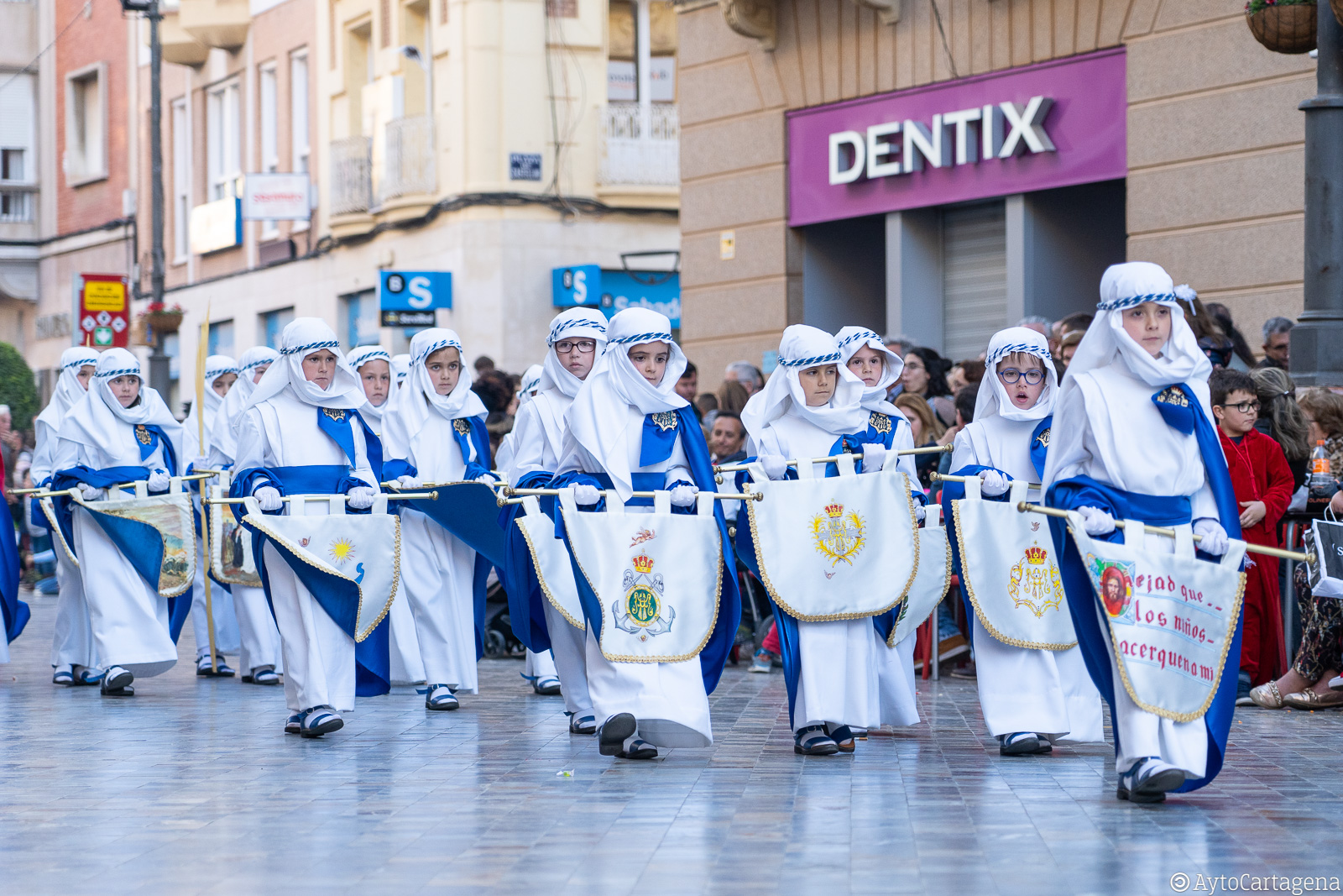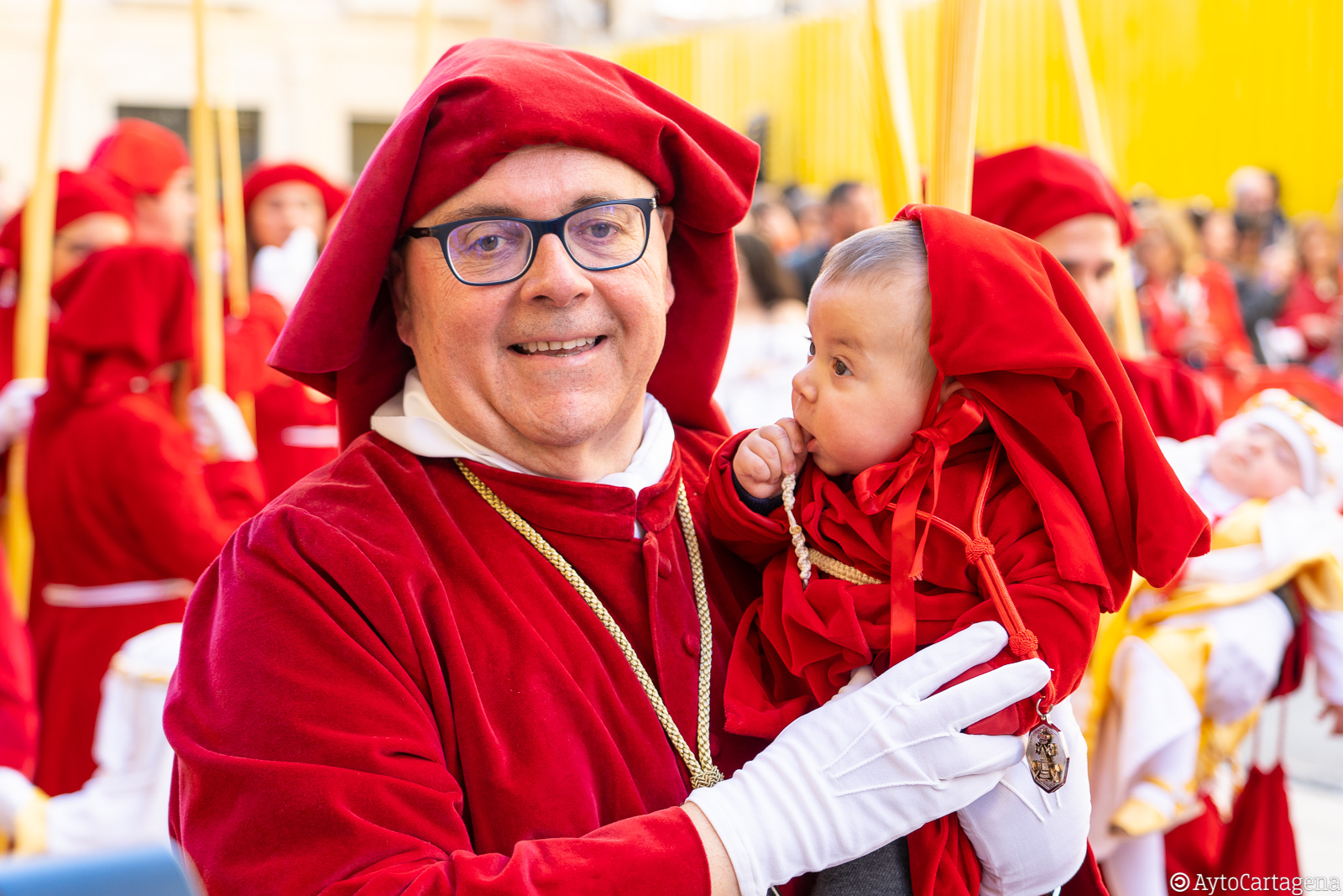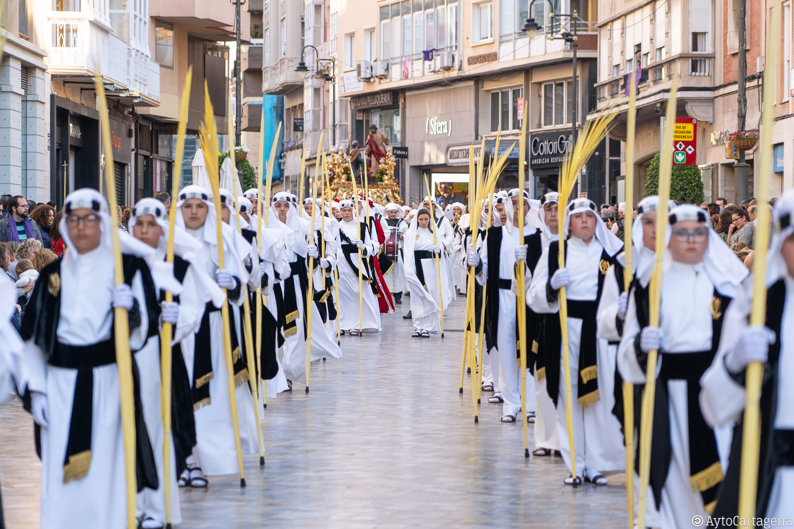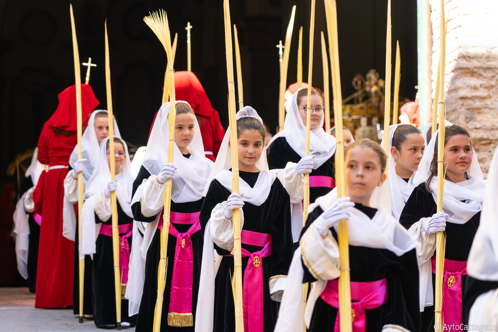 Las calles de la ciudad se inundaron de niños ataviados con trajes de hebreos conjuntados por los colores de las agrupaciones a las que pertenecen. Un desfile salpicado de palmas y varas de olivos armonizado con el típico ritmo cadencioso de las procesiones cartageneras.