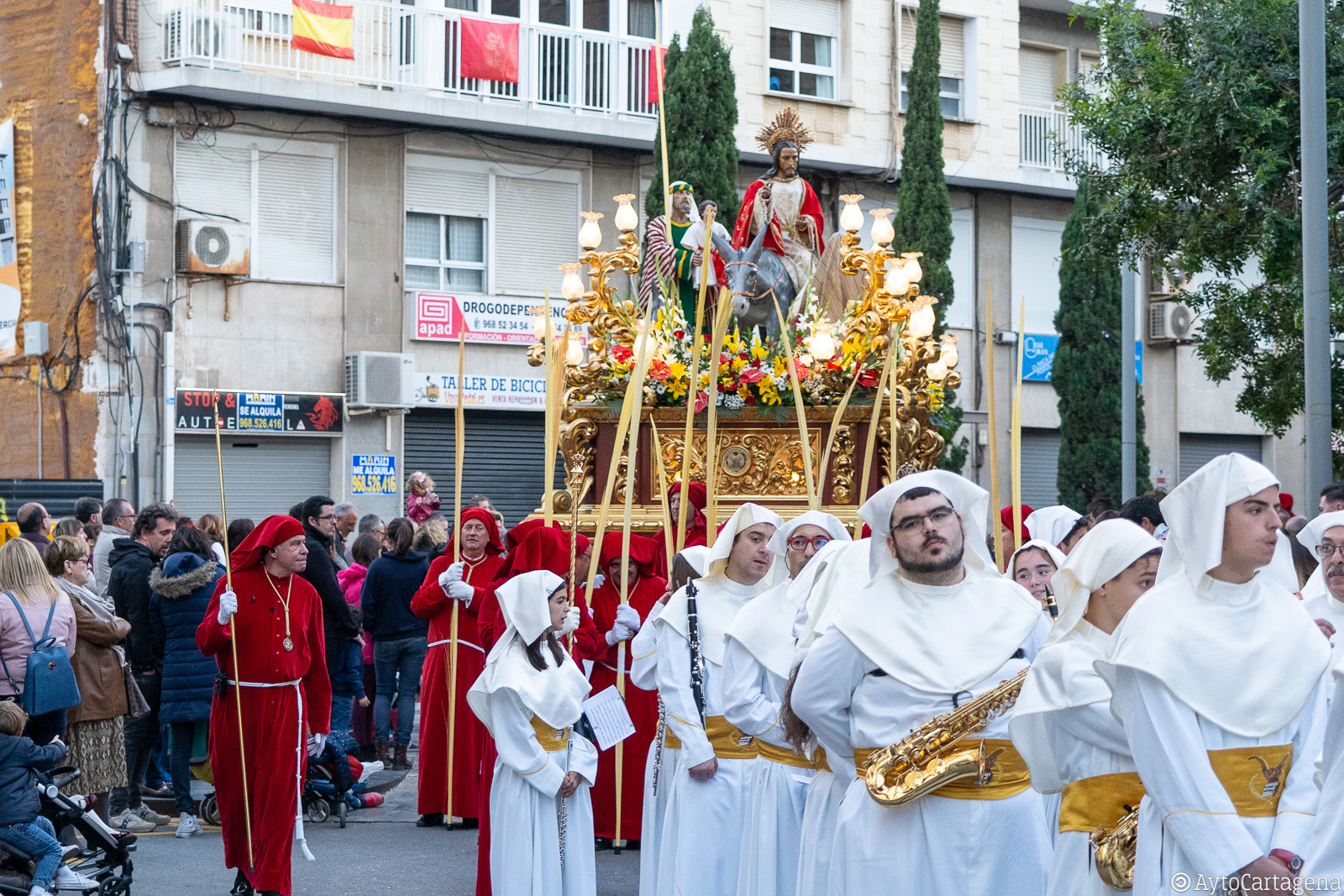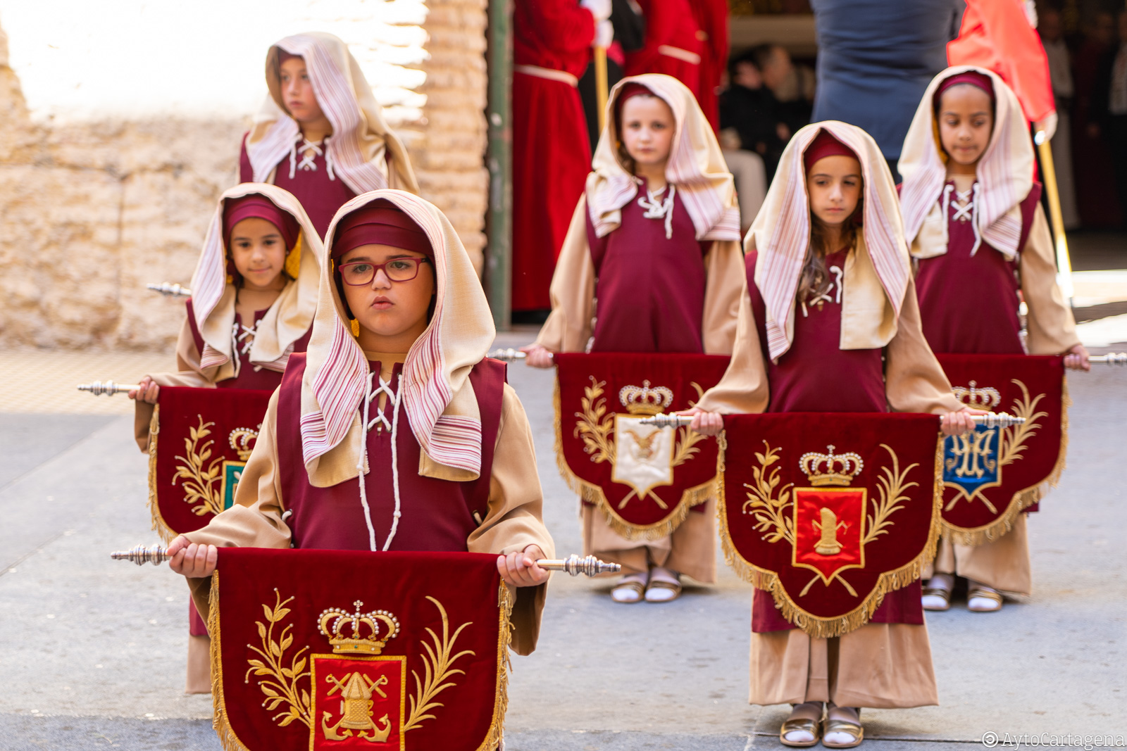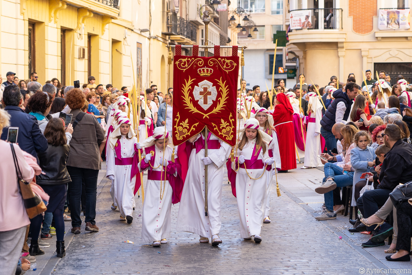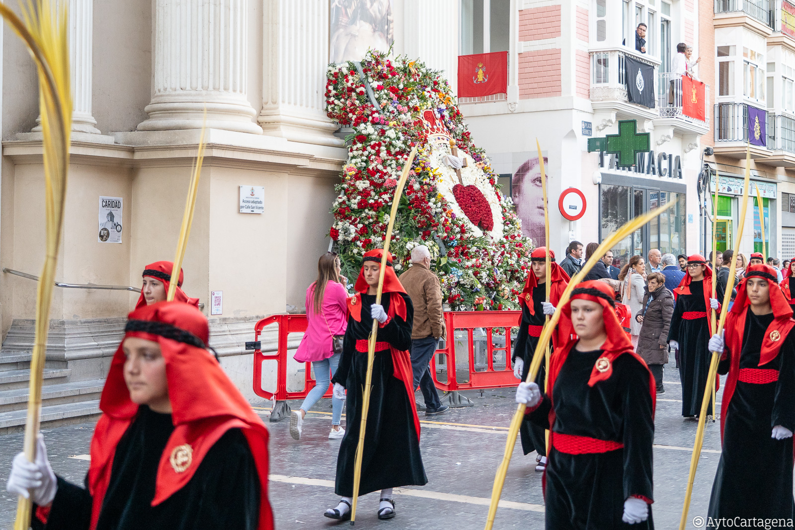 Las calles de la ciudad se inundaron de niños ataviados con trajes de hebreos conjuntados por los colores de las agrupaciones a las que pertenecen. Un desfile salpicado de palmas y varas de olivos armonizado con el típico ritmo cadencioso de las procesiones cartageneras.