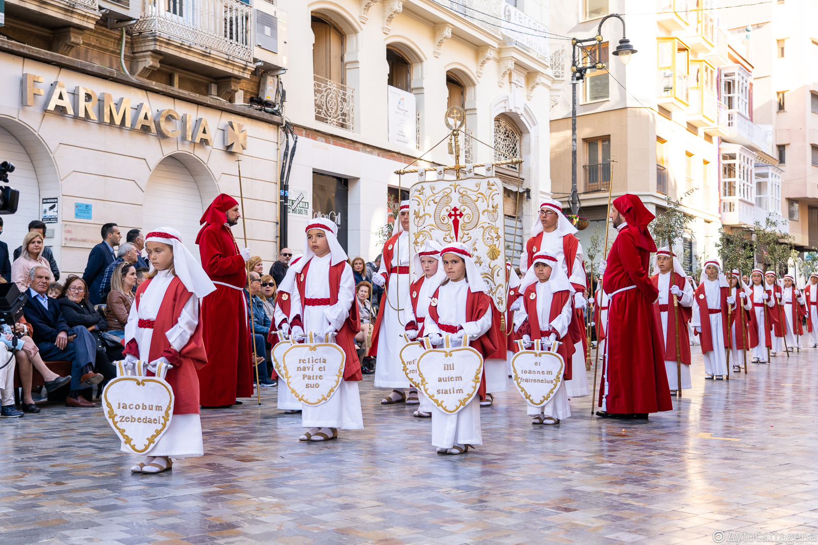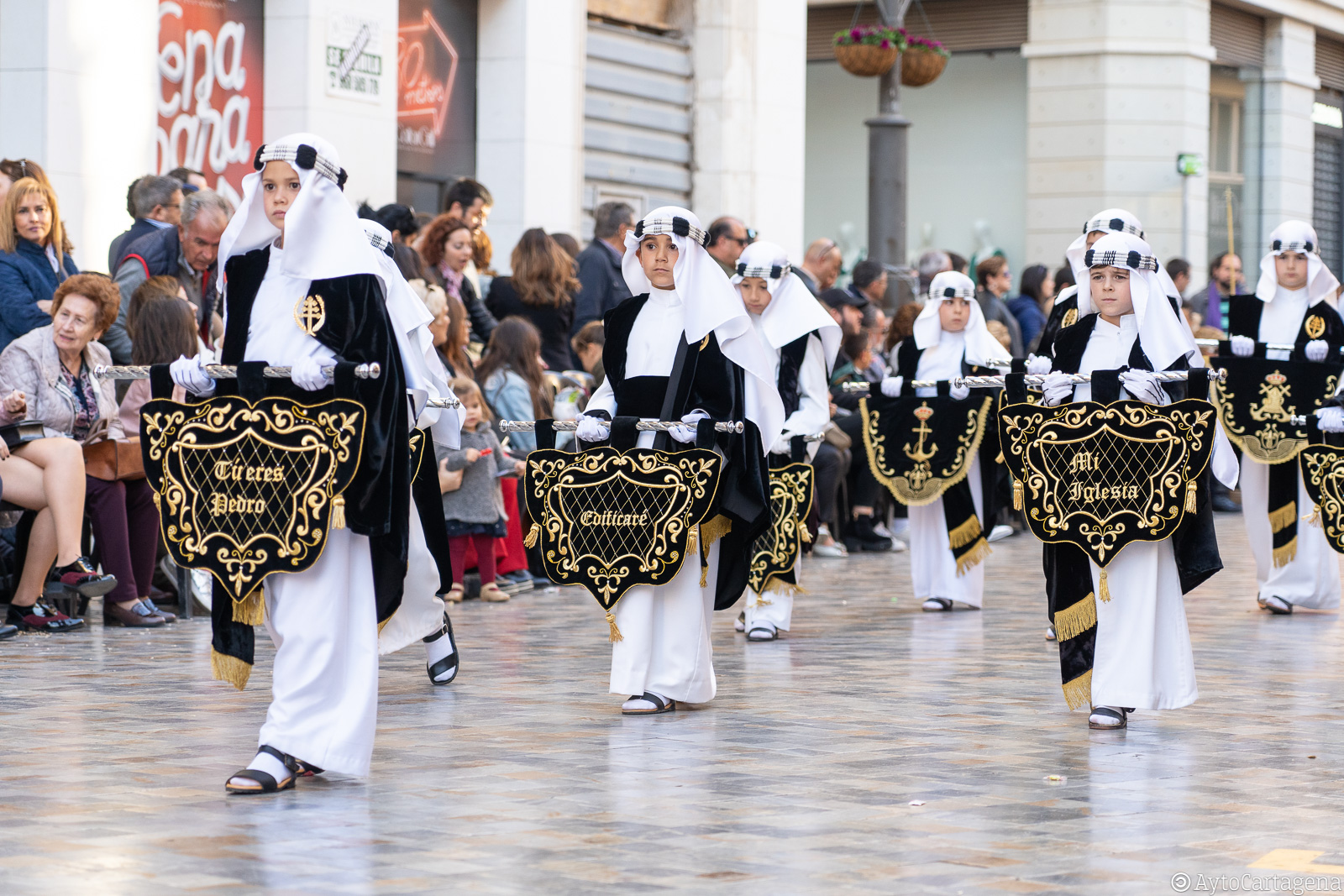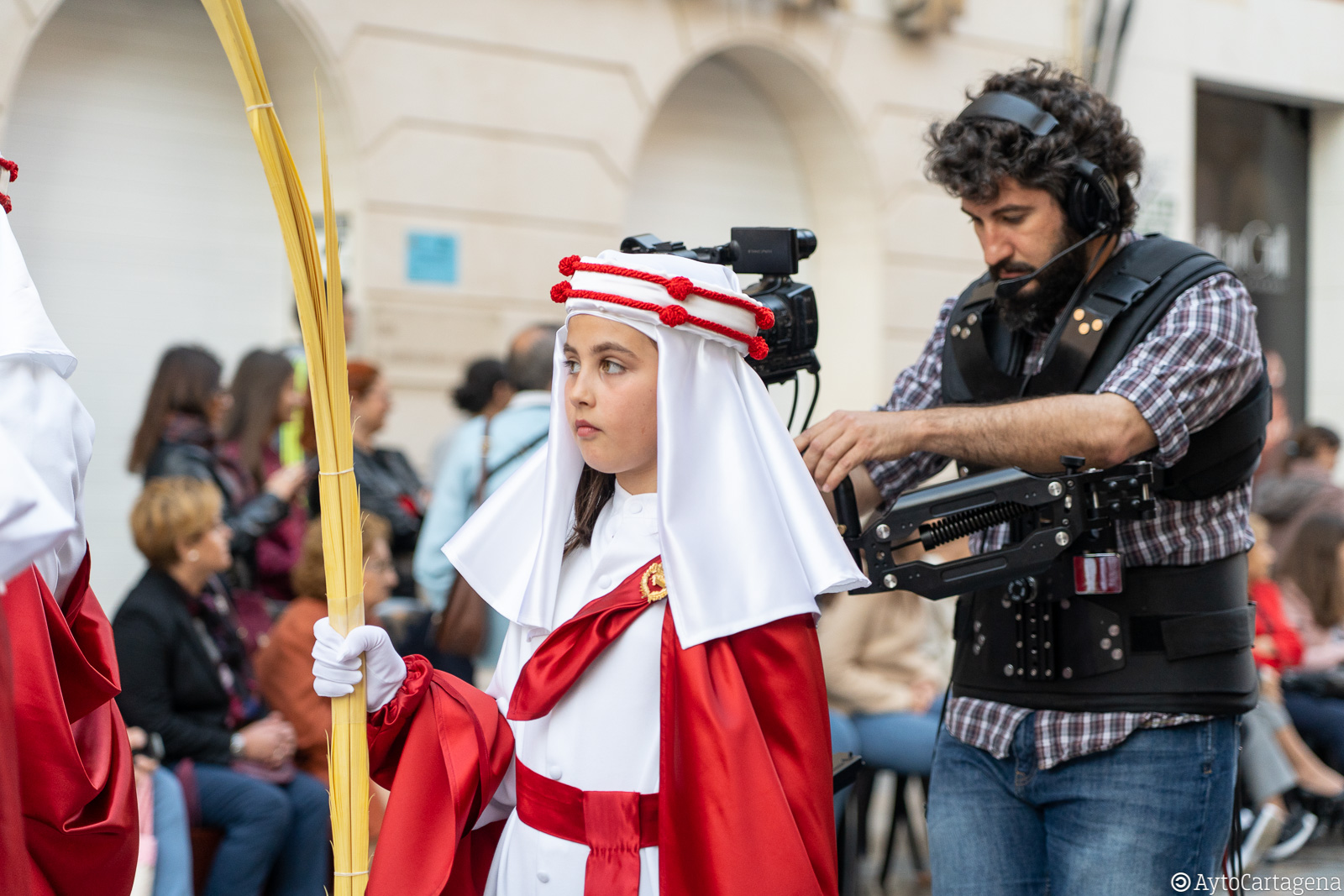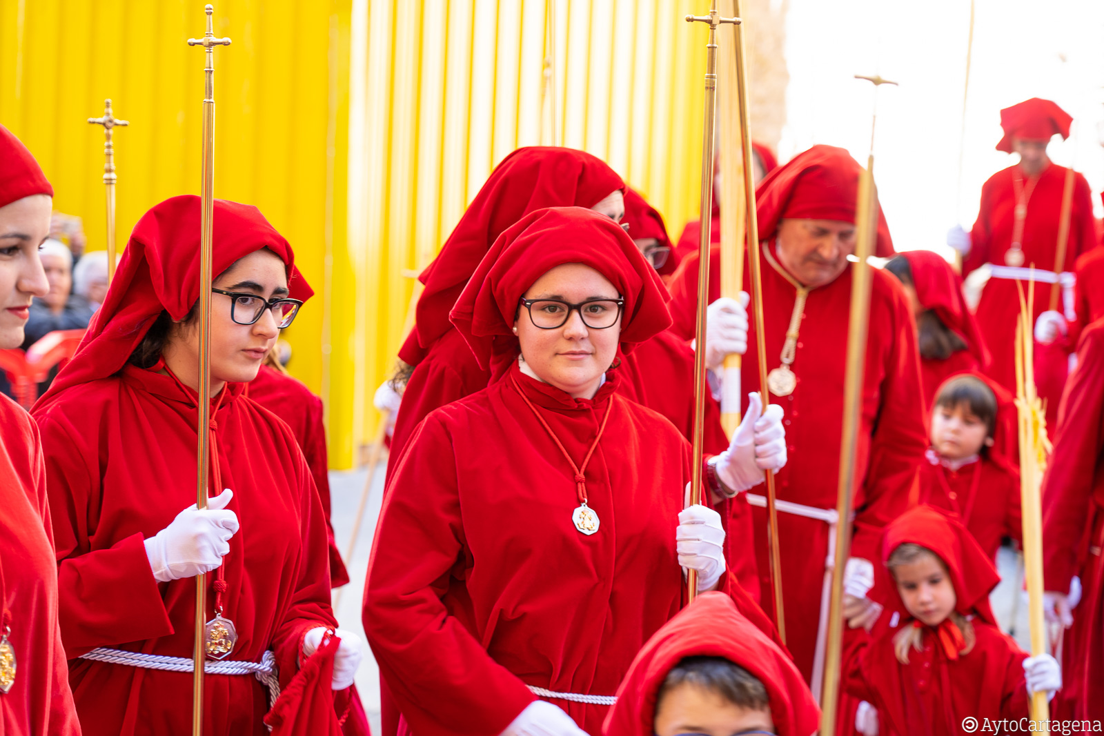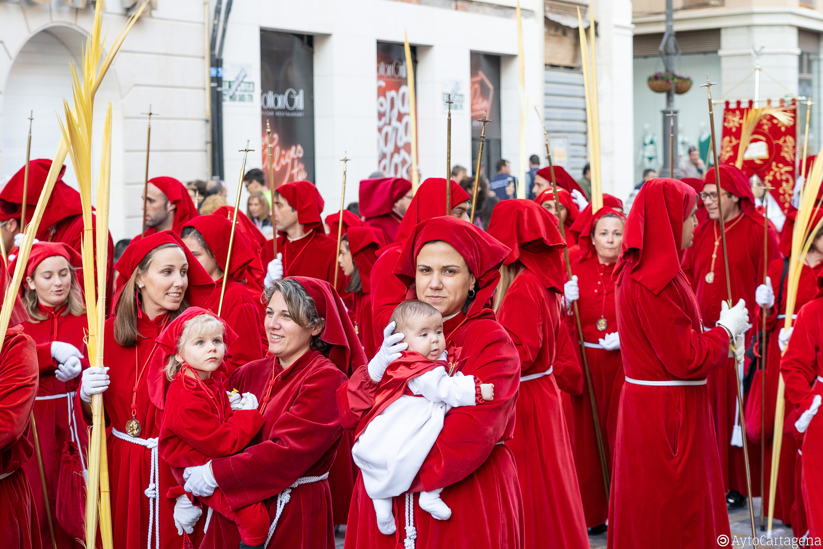 Las calles de la ciudad se inundaron de niños ataviados con trajes de hebreos conjuntados por los colores de las agrupaciones a las que pertenecen. Un desfile salpicado de palmas y varas de olivos armonizado con el típico ritmo cadencioso de las procesiones cartageneras.