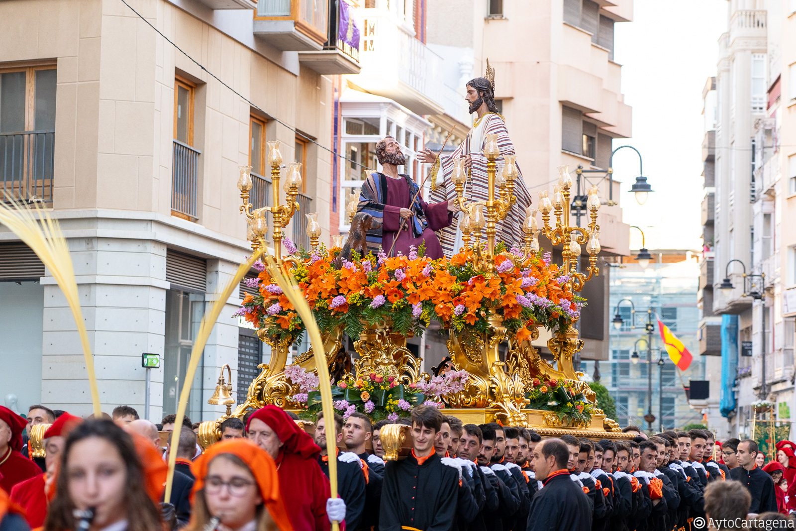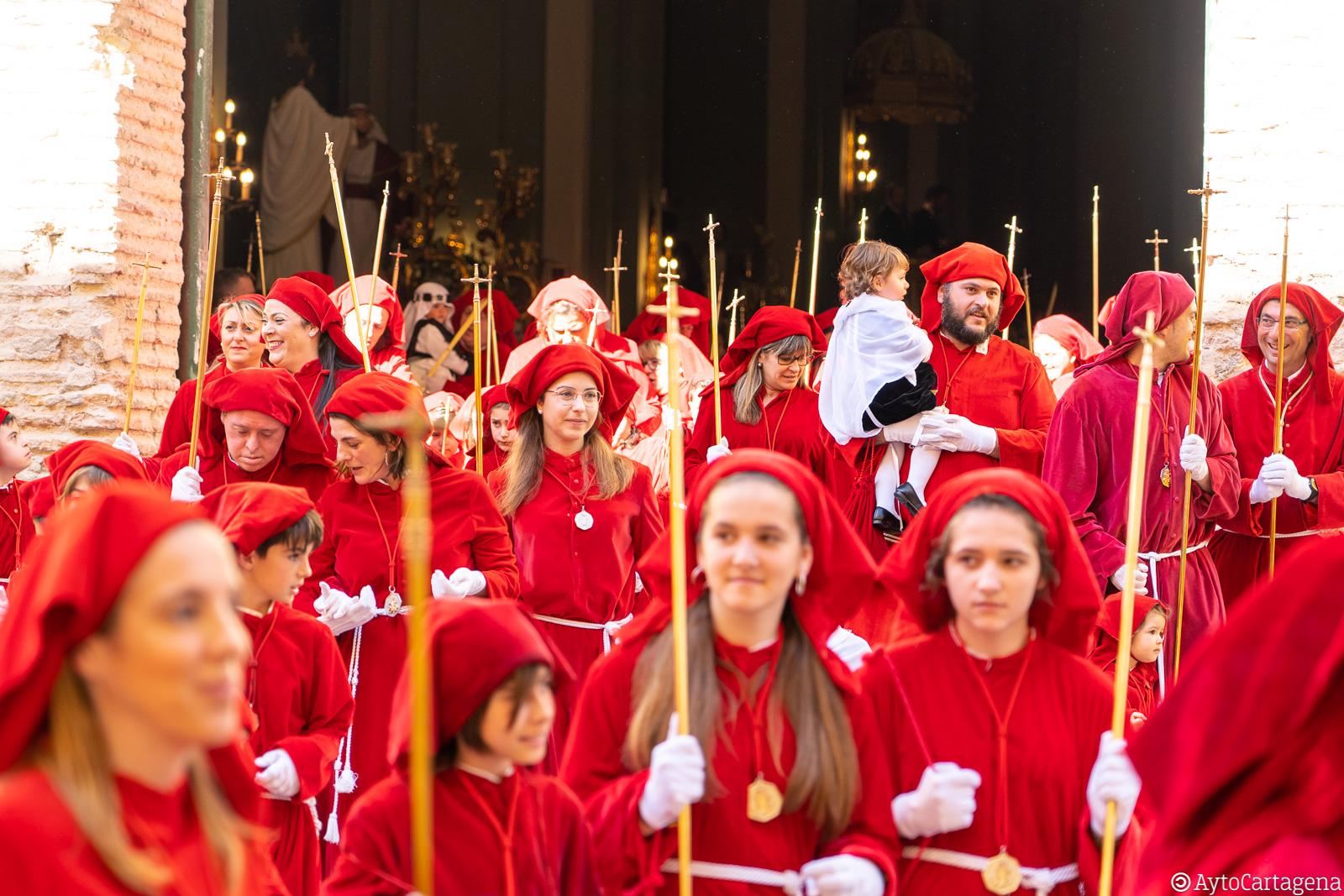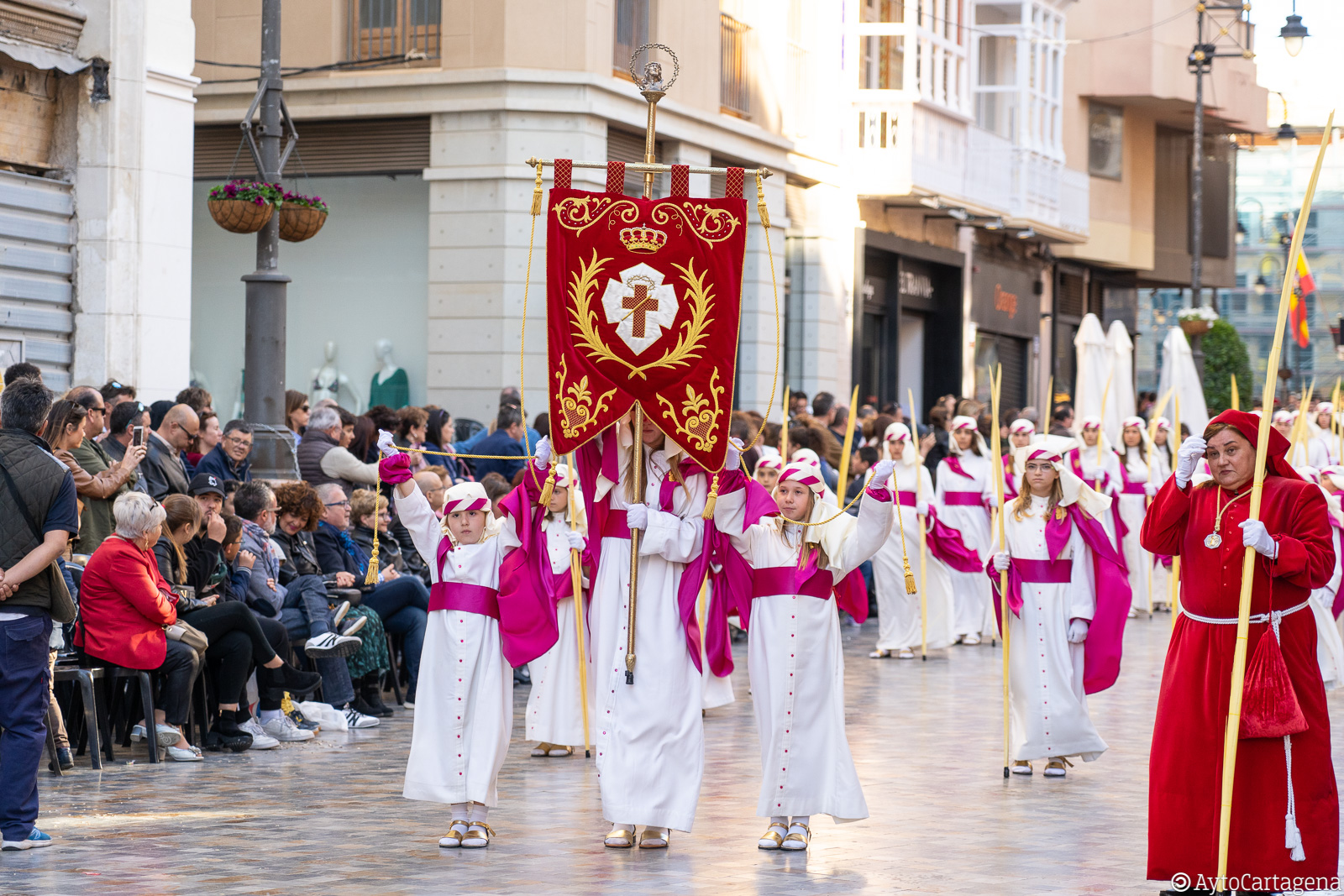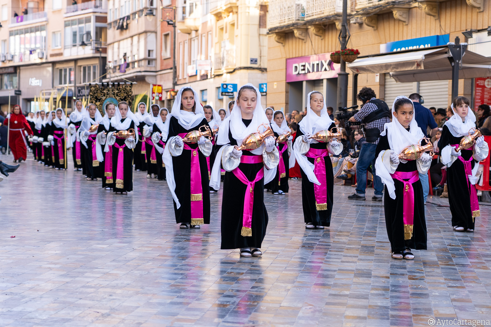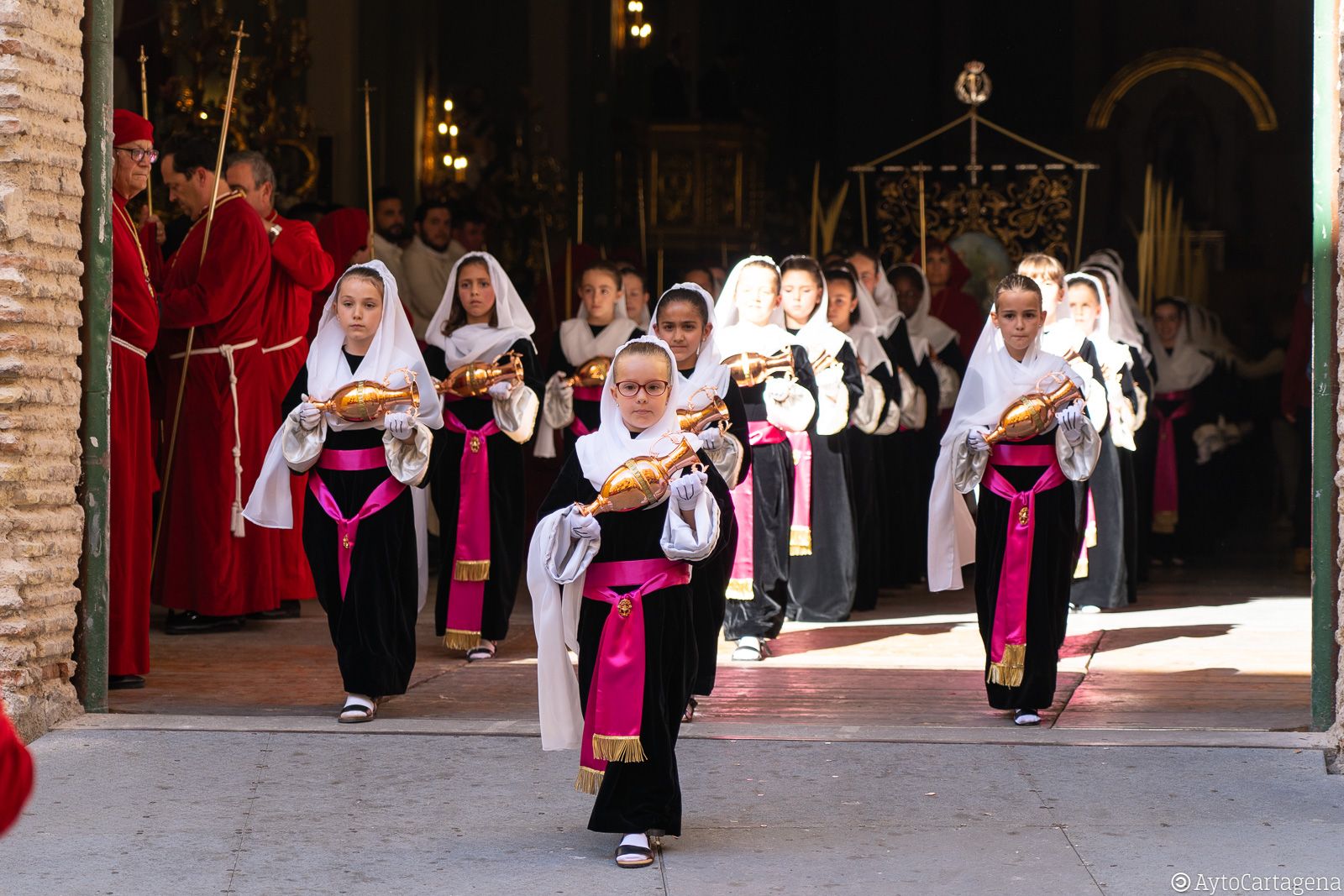 Las calles de la ciudad se inundaron de niños ataviados con trajes de hebreos conjuntados por los colores de las agrupaciones a las que pertenecen. Un desfile salpicado de palmas y varas de olivos armonizado con el típico ritmo cadencioso de las procesiones cartageneras.