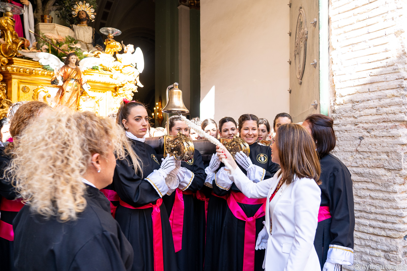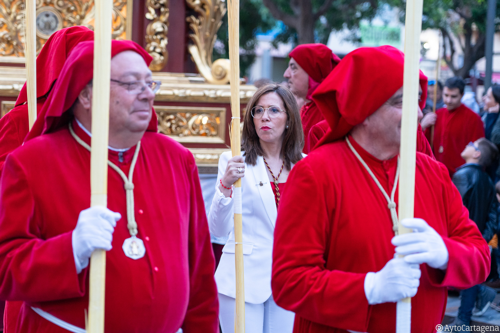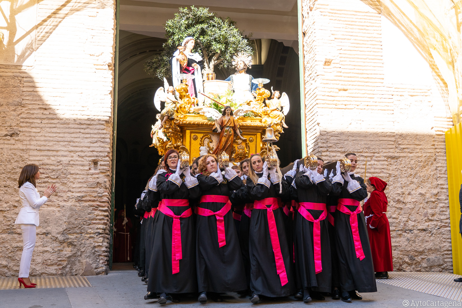 La alcaldesa de Cartagena, Ana Belén Castejón, no quiso perderse esta procesión juvenil en la que los hebreos de Santiago Apóstol dieron otro color a la marea amarilla portando varas de olivo.
